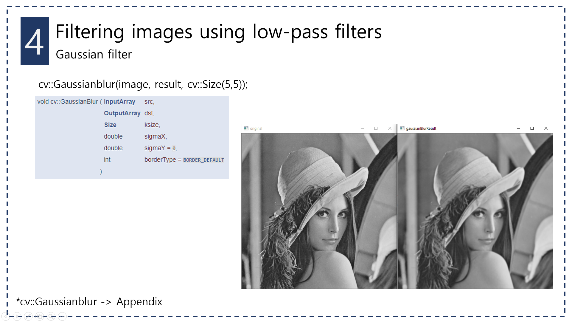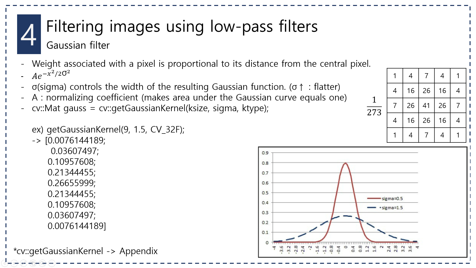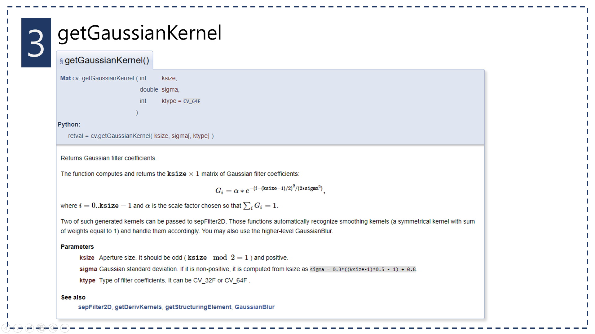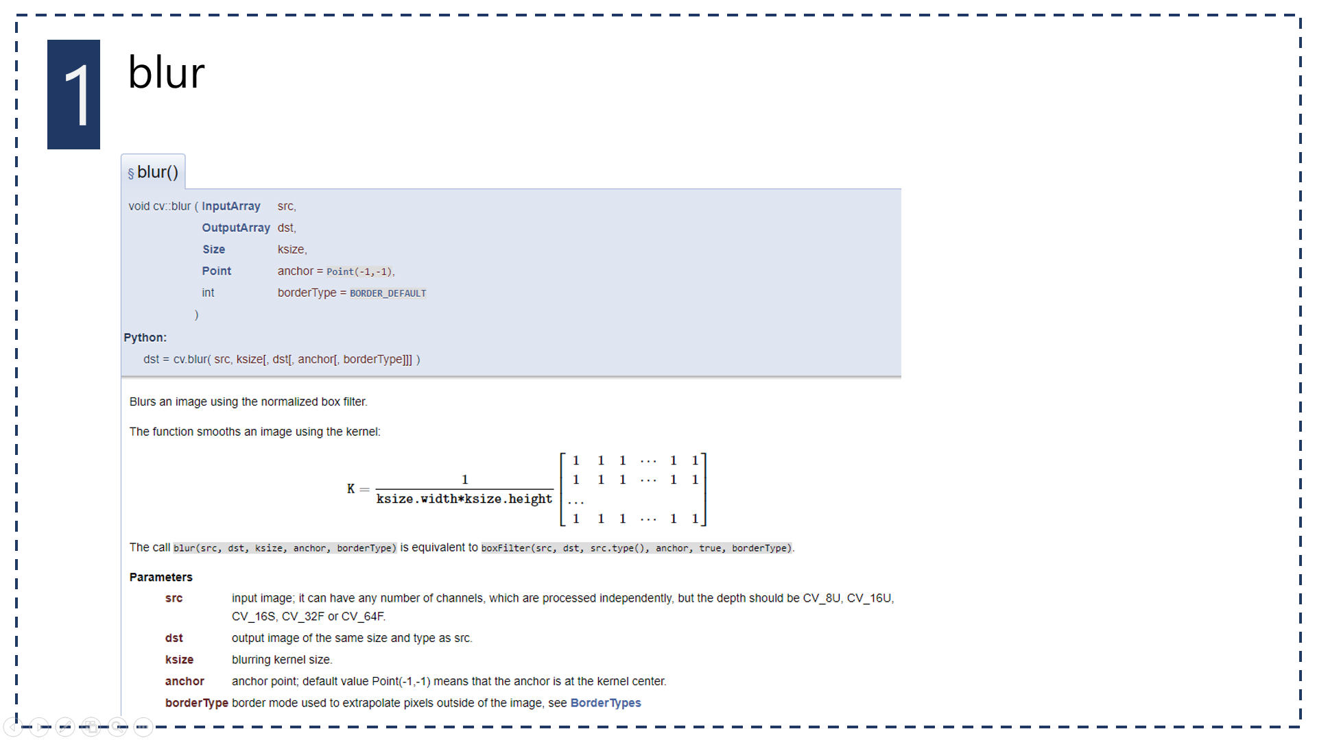이전까지 간단하게 openCV에서 이미지를 불러오고 pixel value에 접근하고 수정하는 법을 배웠는데, 앞으로 한동안 filter에 대해서 배워보고자 한다. (중간을 건너뛰는 이유는 단순하게 filter가 먼저 궁금해서이다.. 나중에 다시 다룰 기회가 있지 않을까 싶다.) 앞으로 문서로 남기는 것이 더 좋을 것 같아서 PPT로 요약 후 그 내용으로 대체하고자 한다. (+ 글이 많으면 읽기가 귀찮다. 한눈으로 볼 수 있게 노력할 예정... 블로그 글에는 약간의 코멘트는 더 추가할 생각이다.)