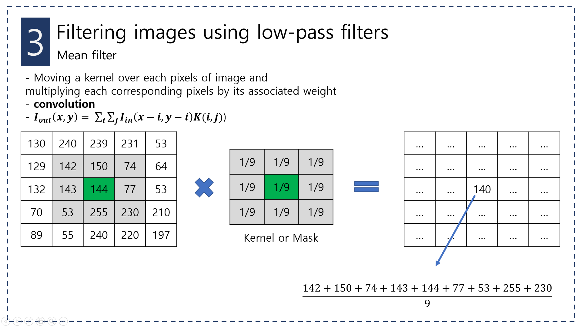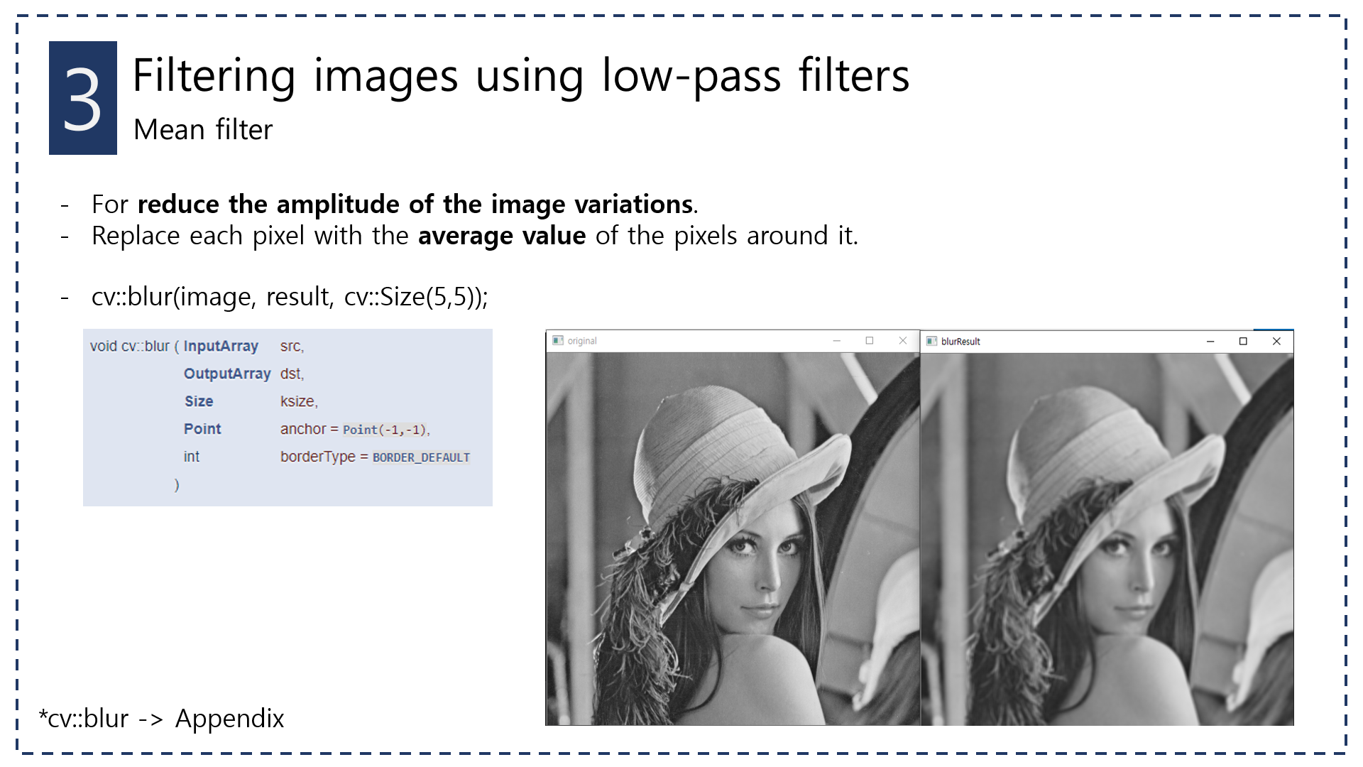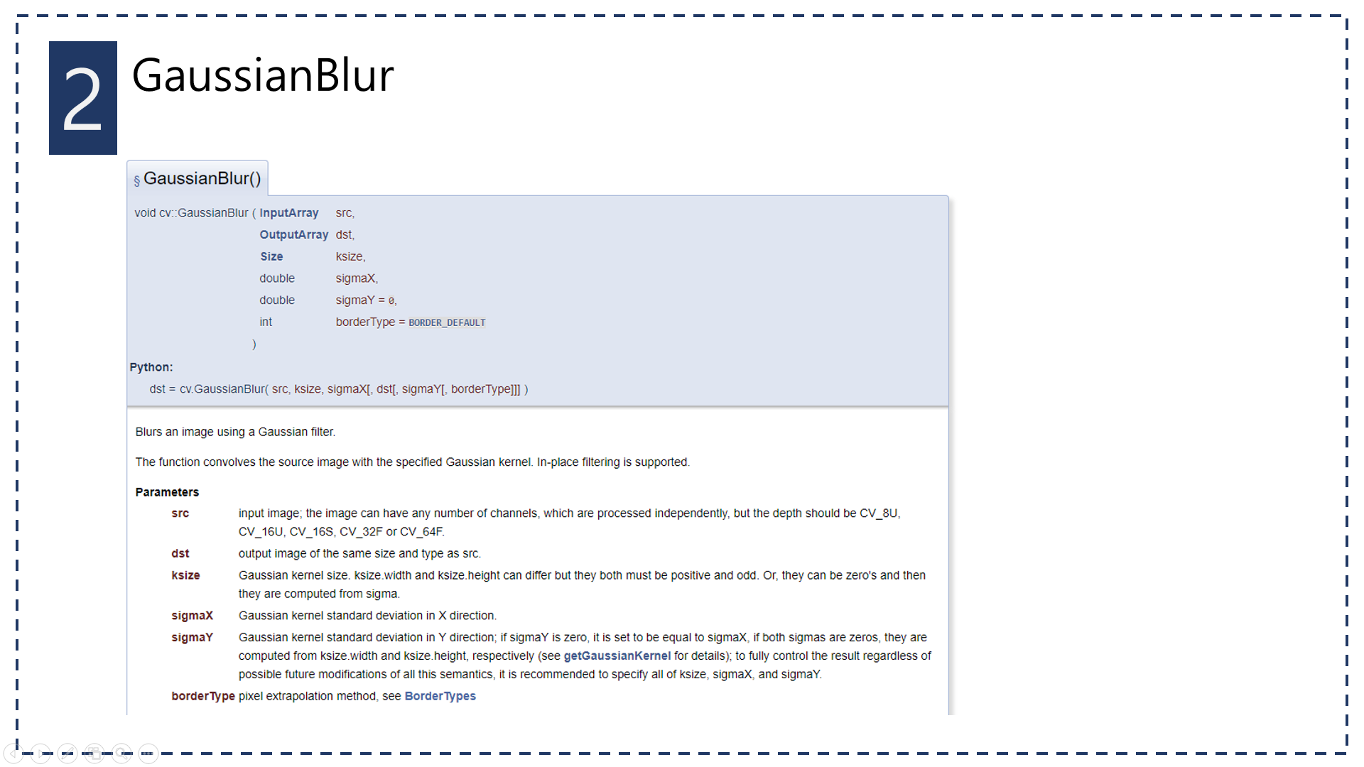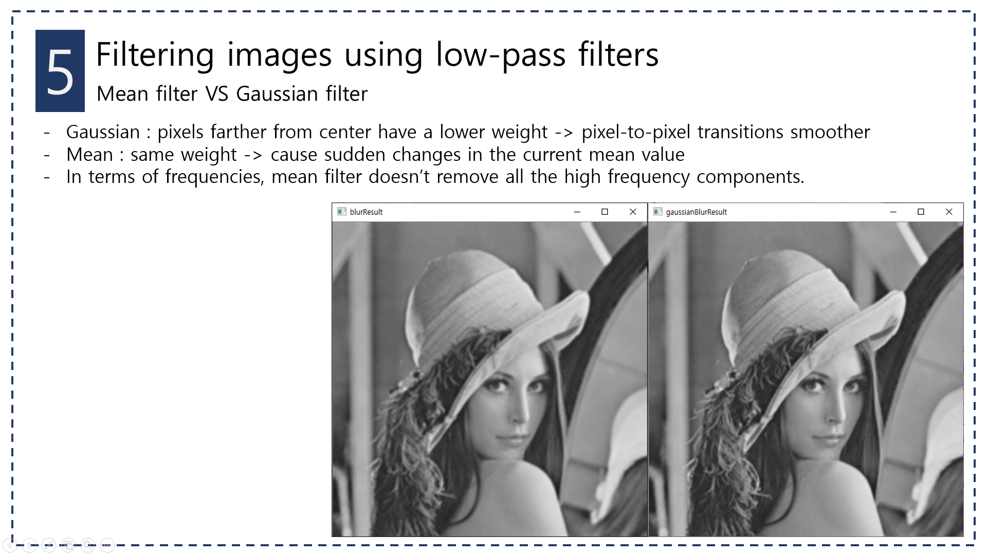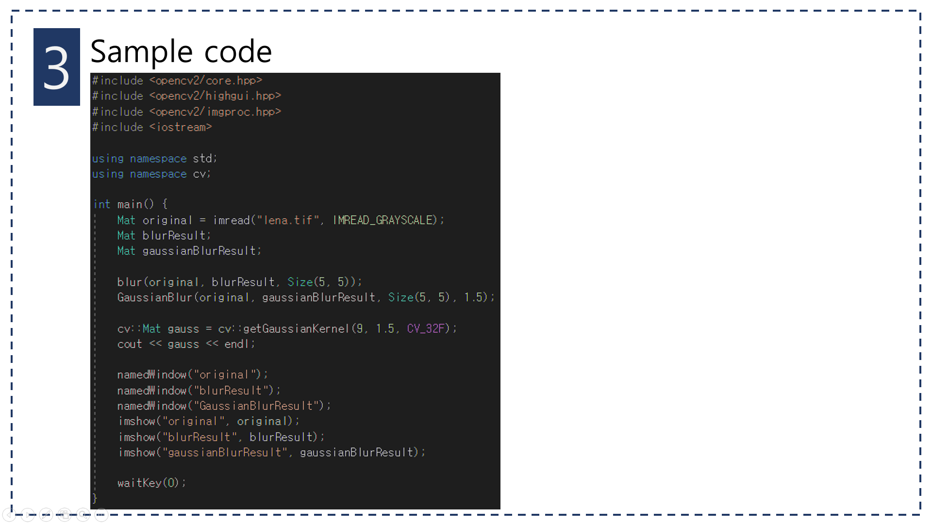이전까지 간단하게 openCV에서 이미지를 불러오고 pixel value에 접근하고 수정하는 법을 배웠는데, 앞으로 한동안 filter에 대해서 배워보고자 한다. (중간을 건너뛰는 이유는 단순하게 filter가 먼저 궁금해서이다.. 나중에 다시 다룰 기회가 있지 않을까 싶다.) 앞으로 문서로 남기는 것이 더 좋을 것 같아서 PPT로 요약 후 그 내용으로 대체하고자 한다. (+ 글이 많으면 읽기가 귀찮다. 한눈으로 볼 수 있게 노력할 예정... 블로그 글에는 약간의 코멘트는 더 추가할 생각이다.)